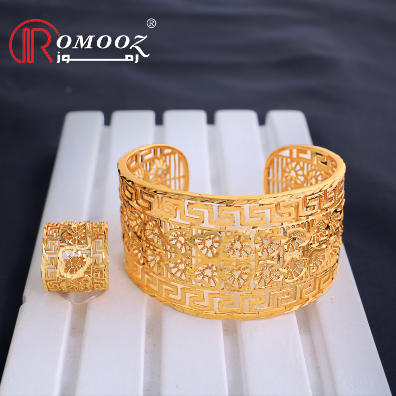 Romooz New Dubai Luxury Jewelery Bangle Bracelet With Ring Set Jewelry Open Cuff 18K Gold Plated Bangle And Ring Set
