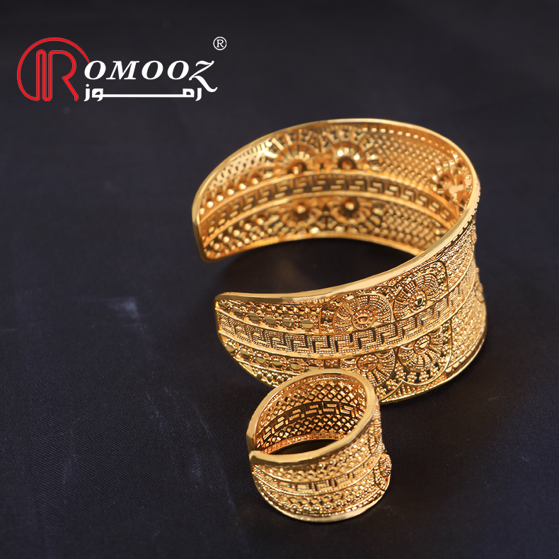 Romooz New Dubai Luxury Jewelery Bangle Bracelet With Ring Set Jewelry Open Cuff 18K Gold Plated Bangle And Ring Set